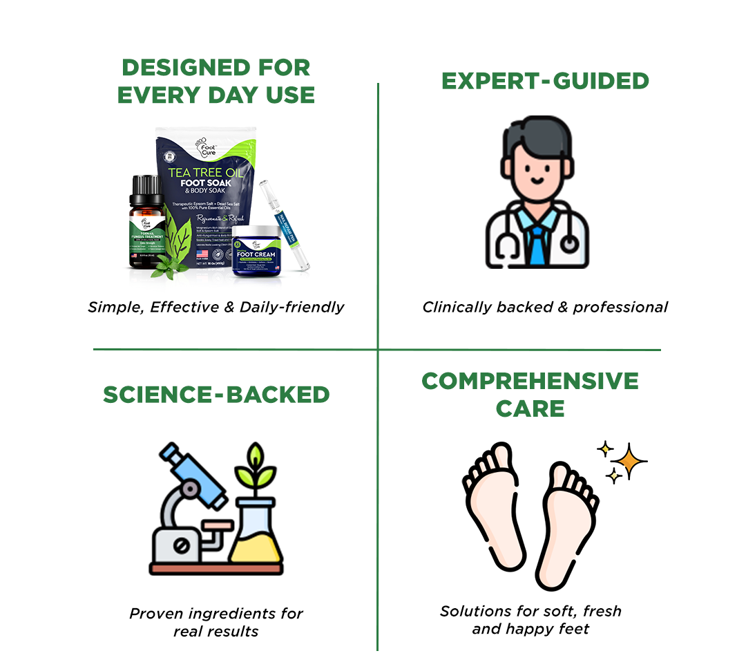 FootCure was created with guidance from medical professionals and foot care experts to ensure products that are not just gentle, but effective. Every formula is designed with attention to real foot care needs — from dry skin and calluses to odor and post-activity relief — and grounded in clinical insights on what works.